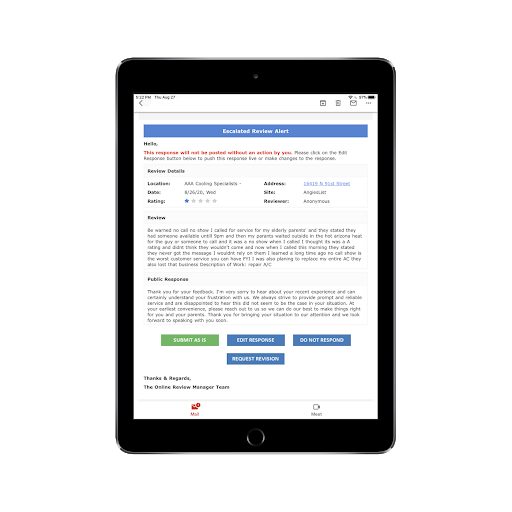 Worried about letting someone respond to reviews on your behalf? With our response escalation features you have the ability to be as involved in the process as you’d like. Your responder can forward you their responses to sensitive reviews and you have the ability to edit, request a revision, or post it live as is. All of this can be done directly from your email or mobile device.